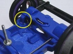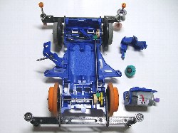 ギヤやシャフト関係はほぼ無加工で使用していますが、これもトルク抜けの無いように配慮しての構造です、ちなみに予選のときはリヤのクラウンギヤ(ピンク)の背面にお得意の小径ワッシャを入れていましたが、当日引いたモーターはナラシが進むにつれ低回転トルク型の特性と判断したので決勝時はトップスピードを伸ばすために小径ワッシャを外しました、でもこのシャーシでは(全部個体差があります)コース特性とモーターが更に回っていれば小径ワッシャを入れたほうが速いかもしれません(謎) |