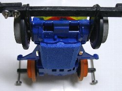 前後ローラーベースは125mmで組みました、コースレイアウト的には本当はあと1mm弱フロントを出した方が良かったかもしれませんが組みあがったらこうなってました(汗 それとリヤバンパーもMTM−Vol01のマシンから移植ですが、ローラー幅は上下とも104.8mmで、全て垂直にセットしています。